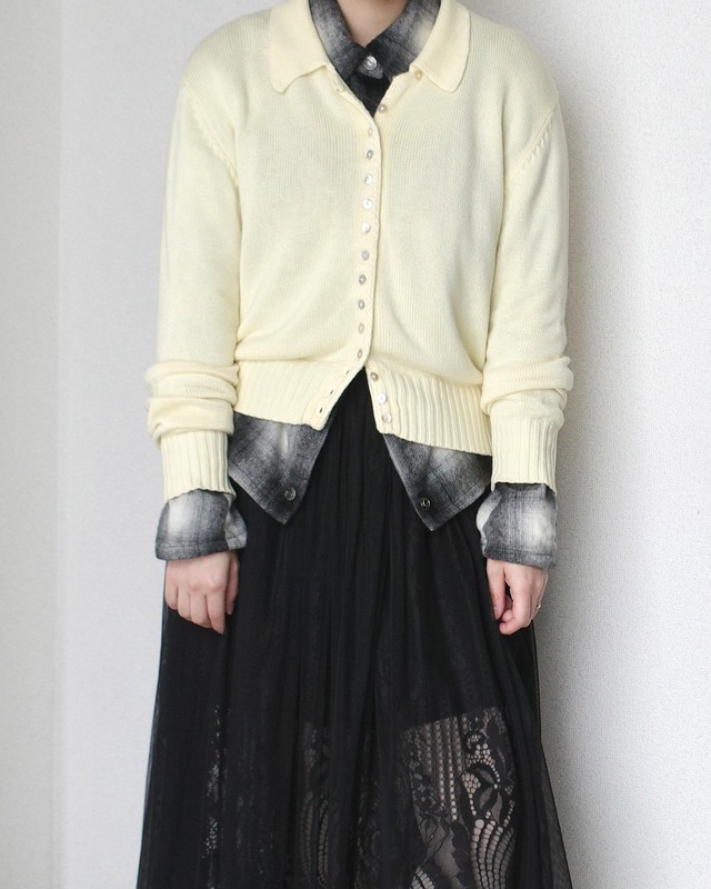 小さなシェルボタンが沢山ついたニットシャツ、 いつだって大好きなディテール。 カーディガン的ですが襟付き、 きちんと感が心地よい。 ビスコースとコットンの混紡で 柔らかくとろみのある肌あたり、 春先まで長くお楽しみ頂けます◎ height : 157cm 【Size】 表記 : 40 身幅約50cm 着丈約55cm 肩幅約42cm 袖丈約67cm 【Quality】 55% VISCOSE 45% COTTON 【Color】 クリーム ※着用画像が自然光下での撮影で、 実物に近いです。 【Condition】 特筆すべきダメージはございませんが、 袖後ろに薄汚れあり(写真8枚目) あくまでも古着商品ということをご理解下さい。 【Attention】 ※サイズは平置き採寸になります。 若干の誤差が生じる場合がございます、 ご理解の程宜しくお願い致します。 ※お使いのモニター・液晶によって実際の色味と異なる場合がございます。 ※古着商品の為、返品・交換・クレーム等は お受けできません。予めご了承下さい。
