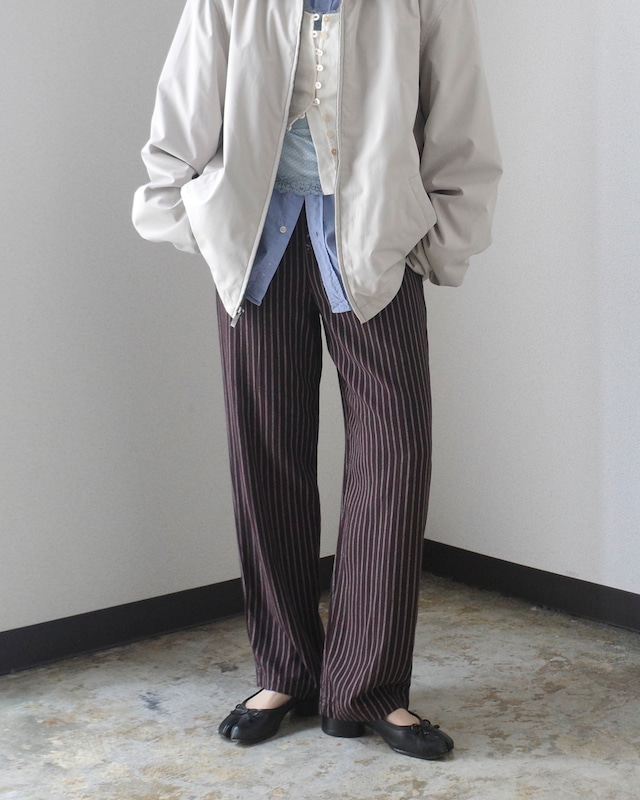 とろみあるレーヨン生地、 春夏に活躍間違いなしな ストライプイージースラックス。 深みあるブラウンのストライプ、 これを探していました。 リラックスした履き心地と どこか品ある雰囲気を両立する、 "欲しい"な一本。 ※ポケットなし、裏地なし ※素材特性上、若干の透け感あり height : 157cm 【Size】 表記 : MEDIUM ウエスト約32-41cm 総丈約97cm 股下約69.5cm 股上約32cm ワタリ約30cm 裾幅約20cm ※ウエストゴム、 紐でさらに絞れます。 【Quality】 made in usa 100% RAYON 【Color】 ブラウン 【Condition】 特筆すべきダメージはございませんが、 あくまでも古着商品ということをご理解下さい。 【Attention】 ※サイズは平置き採寸になります。 若干の誤差が生じる場合がございます、 ご理解の程宜しくお願い致します。 ※お使いのモニター・液晶によって実際の色味と異なる場合がございます。 ※古着商品の為、返品・交換・クレーム等は お受けできません。予めご了承下さい。