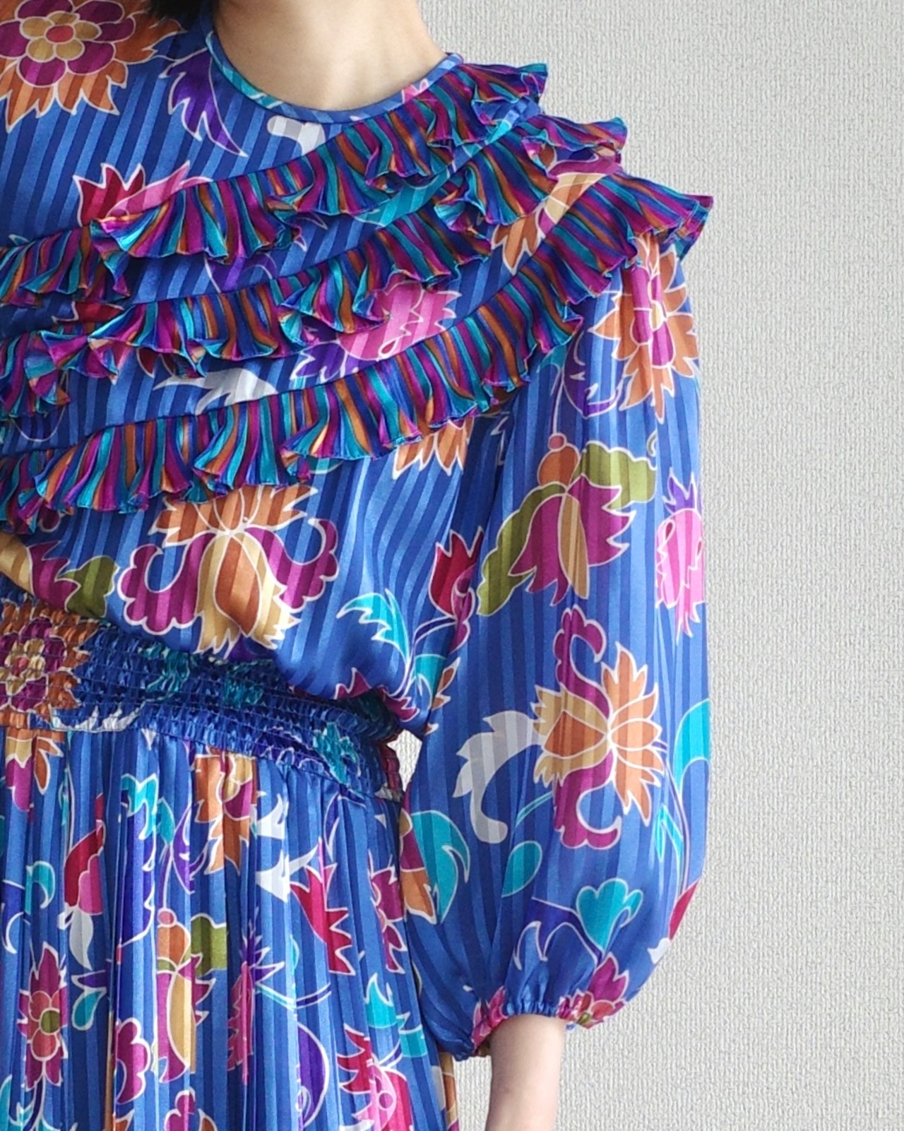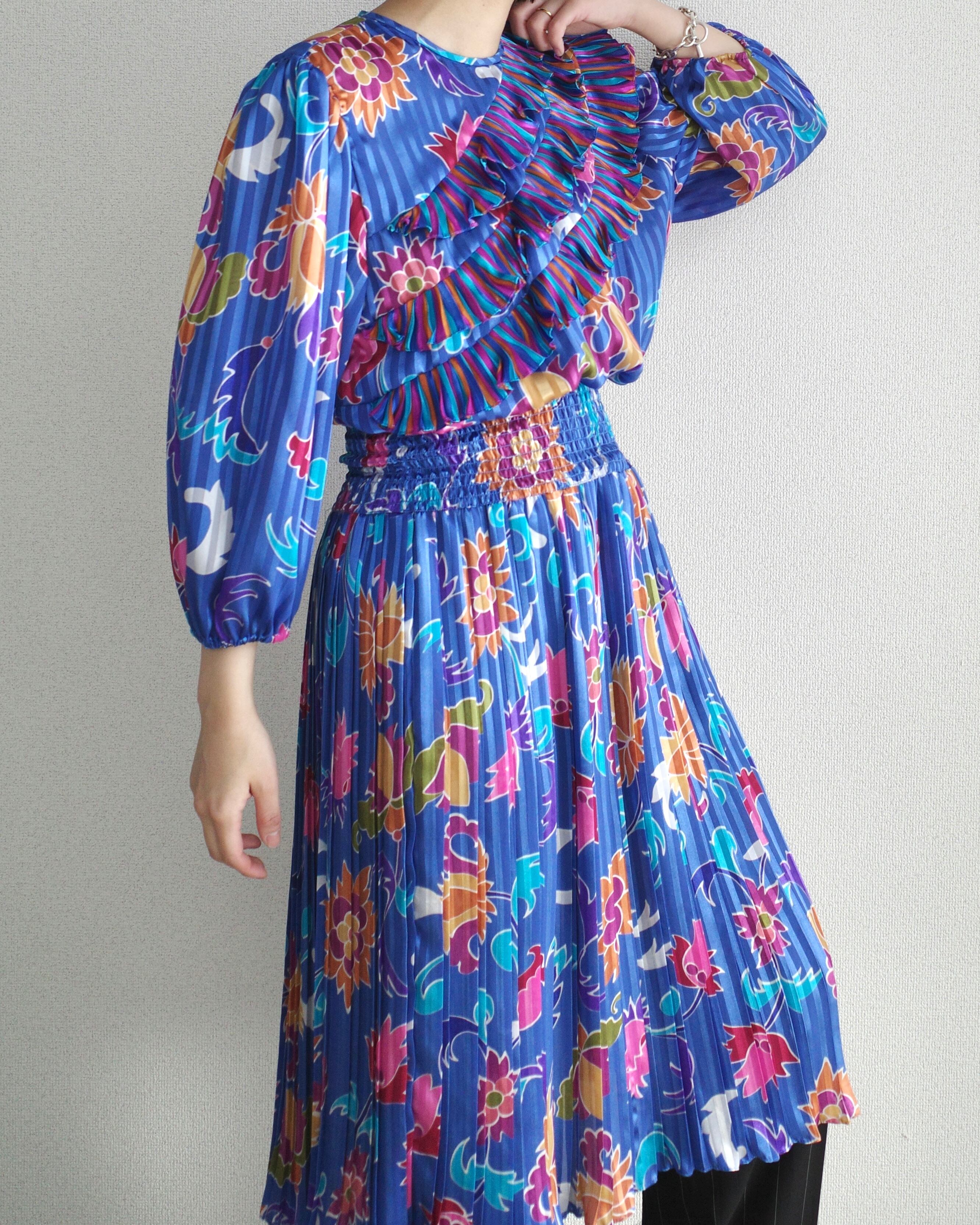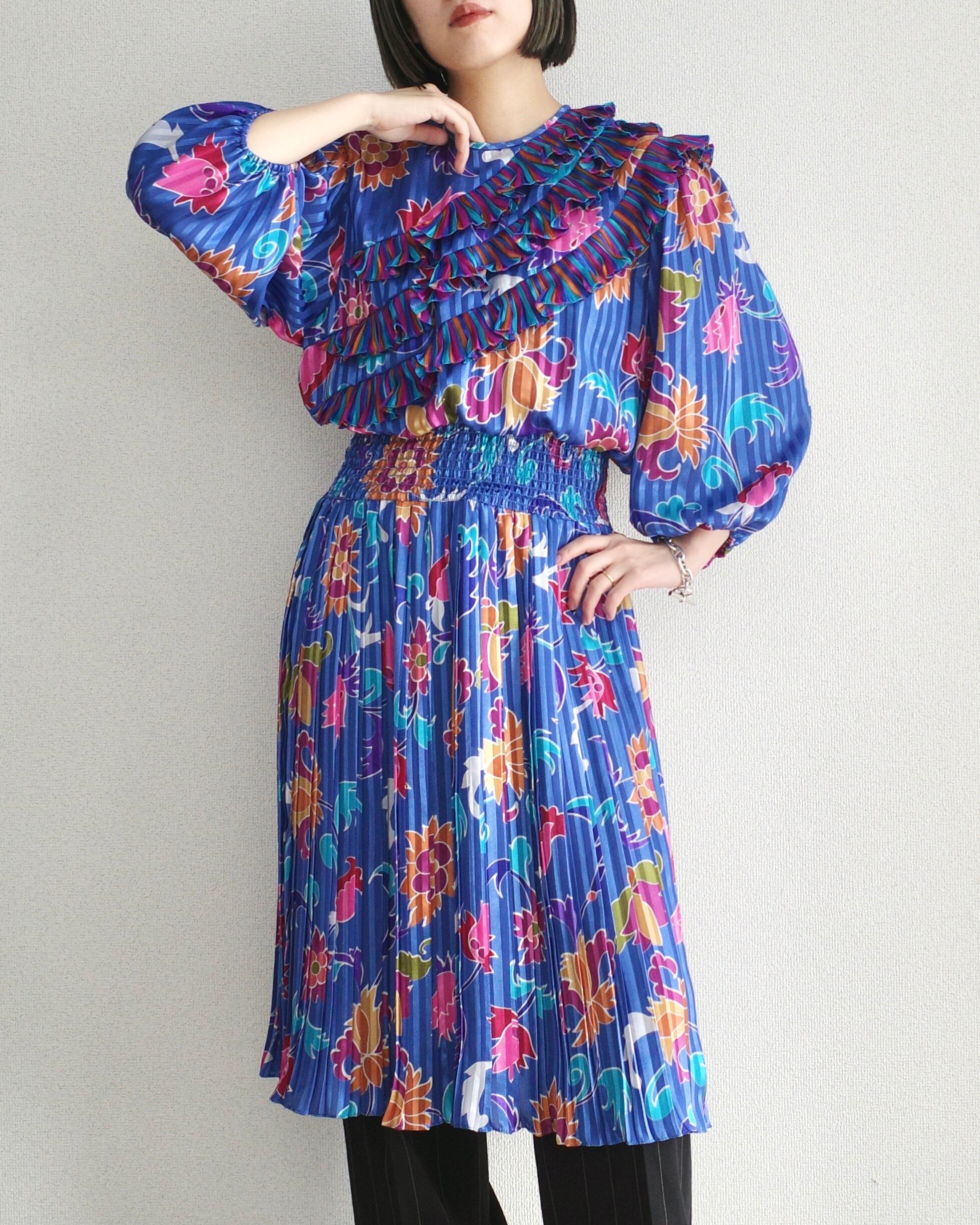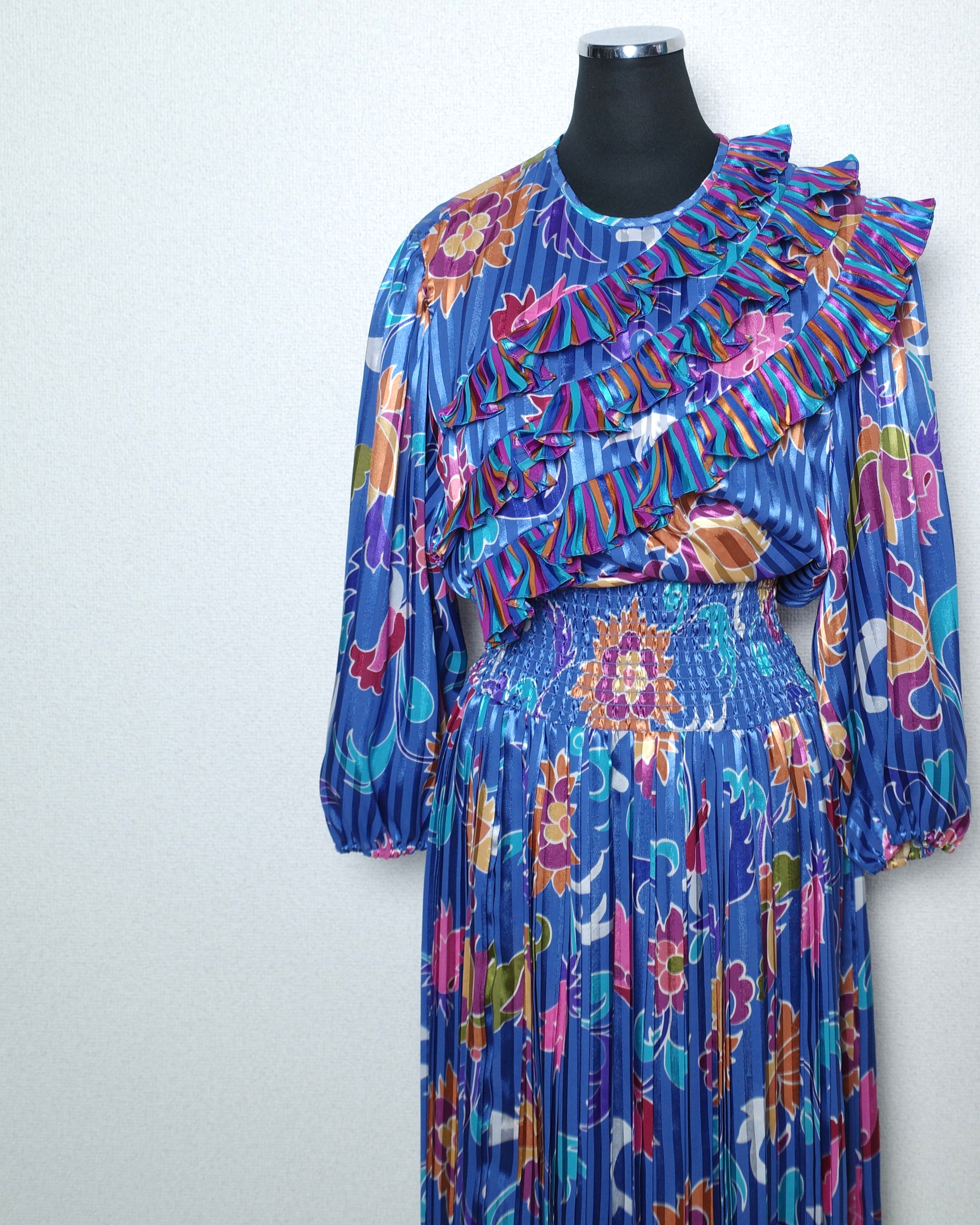 1980's, Asymmetry Ruffle× Pleats Design Dress
